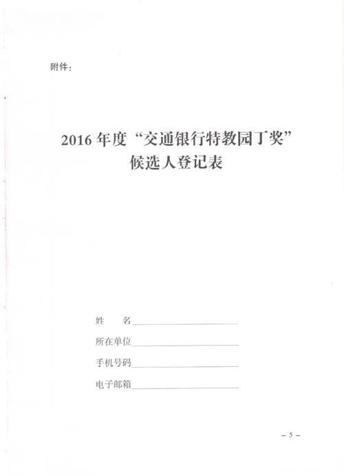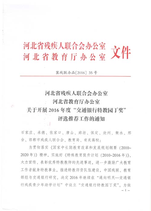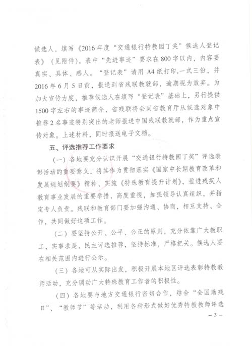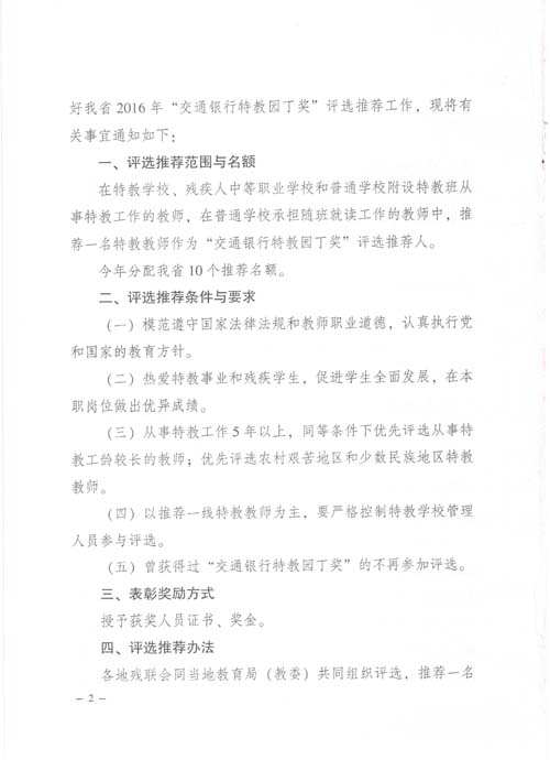 关于开展2016年度“交通银行特教园丁奖”评选推荐工作的通知