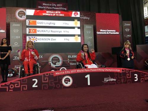 11月30日至12月9日,2017世界残奥举重锦标赛在墨西哥举行,有71个国家和地区参赛。我国派出25名运动员参加比赛,共获得5金 5银 2铜 ,打破2项世界纪录,高居金牌榜、奖牌榜榜首。我省4名参赛运动员表现不俗,郭玲玲以110公斤的成绩获女子45公斤级金牌,并打破世界纪录;郑飞飞以130公斤的成绩获得女子86公斤级银牌;石珊珊获得女子55公斤级第四名。闫盼盼获得男子97公斤级第八名。