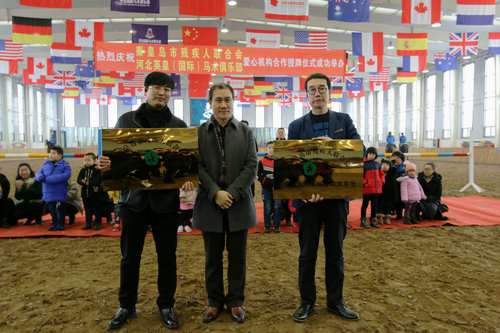 图为河北省秦皇岛市残联党组书记、理事长蒋玉洪为英皇马术俱乐部授牌