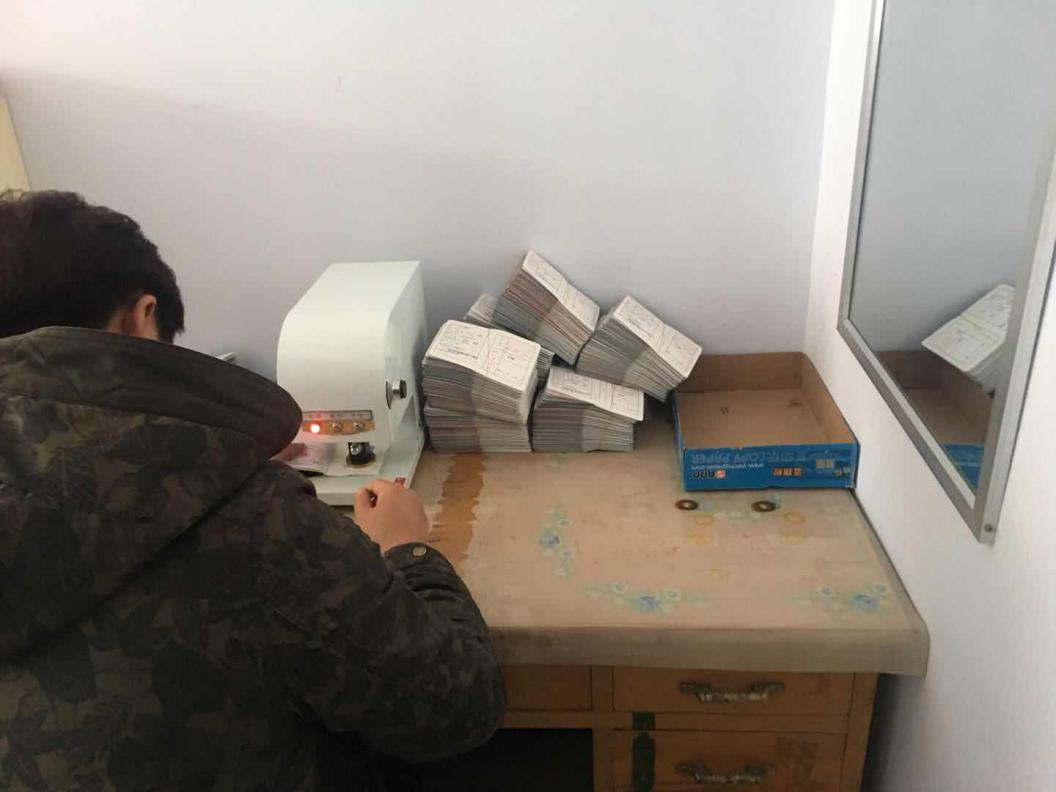 ?图为残联工作人员为残疾人证加盖钢印