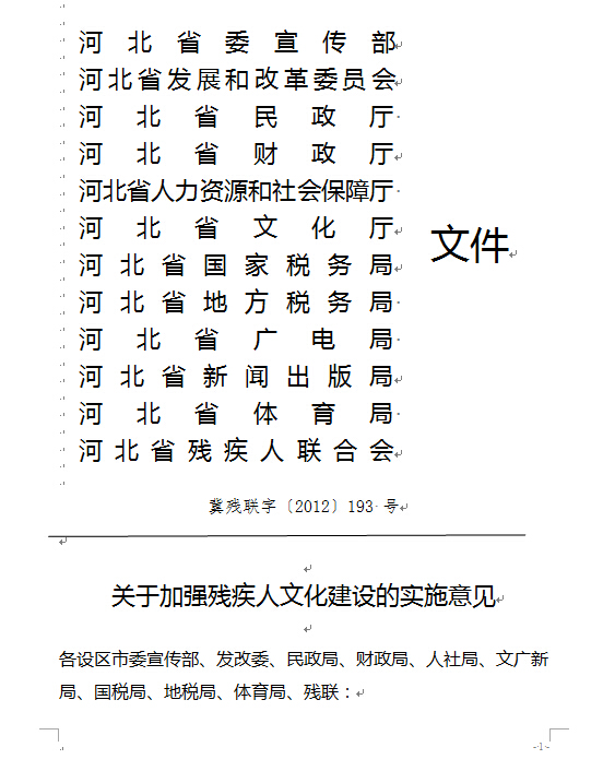 为贯彻中共中央宣传部等11个部门联合下发的《关于加强残疾人文化建设的意见》(残联发[2012]7号,以下简称《意见》)和省委省政府《关于推进残疾人事业发展的意见》(冀发[2009]13号),进一步繁荣发展残疾人文化事业,结合我省实际,制定如下实施意见。