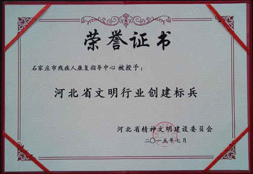日前,河北省精神文明建设委员会颁发《关于表彰河北省文明行业创建标兵的决定》,石家庄市残疾人康复指导中心被授予“河北省文明行业创建标兵” 荣誉称号。